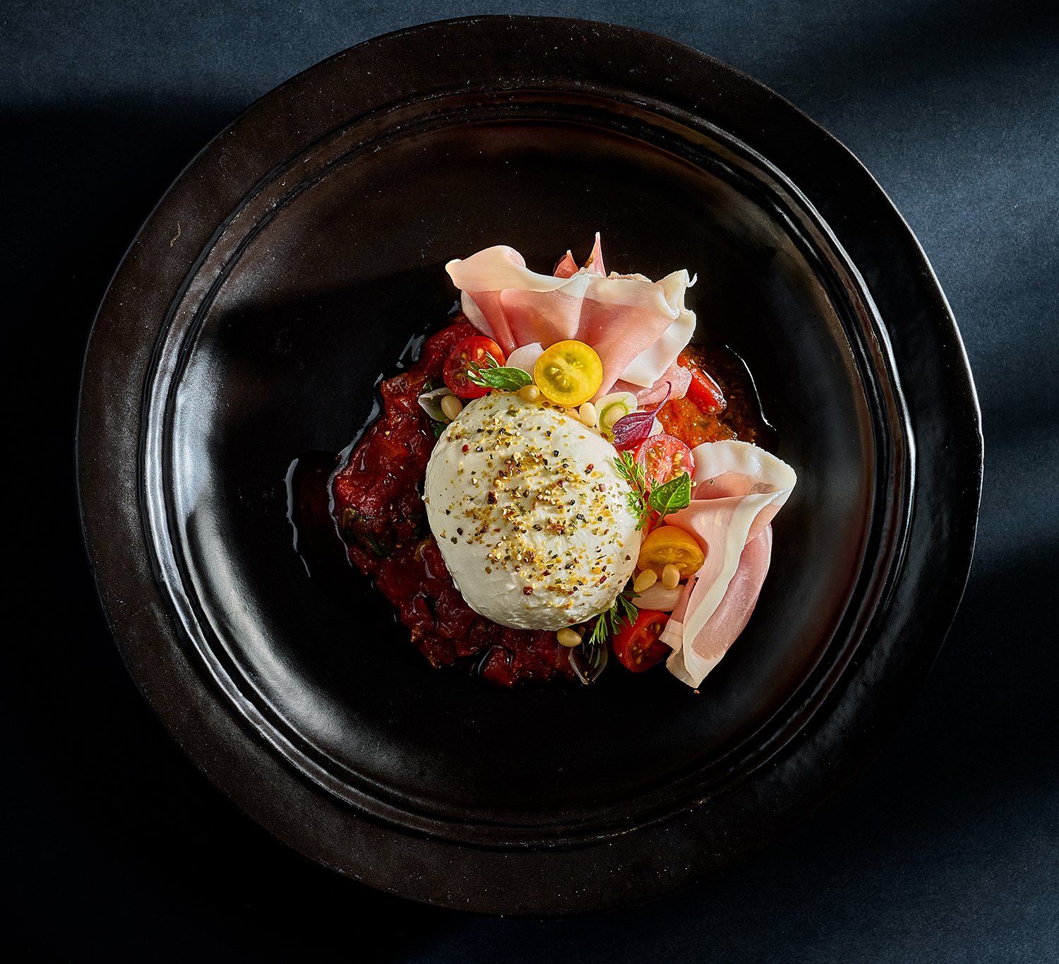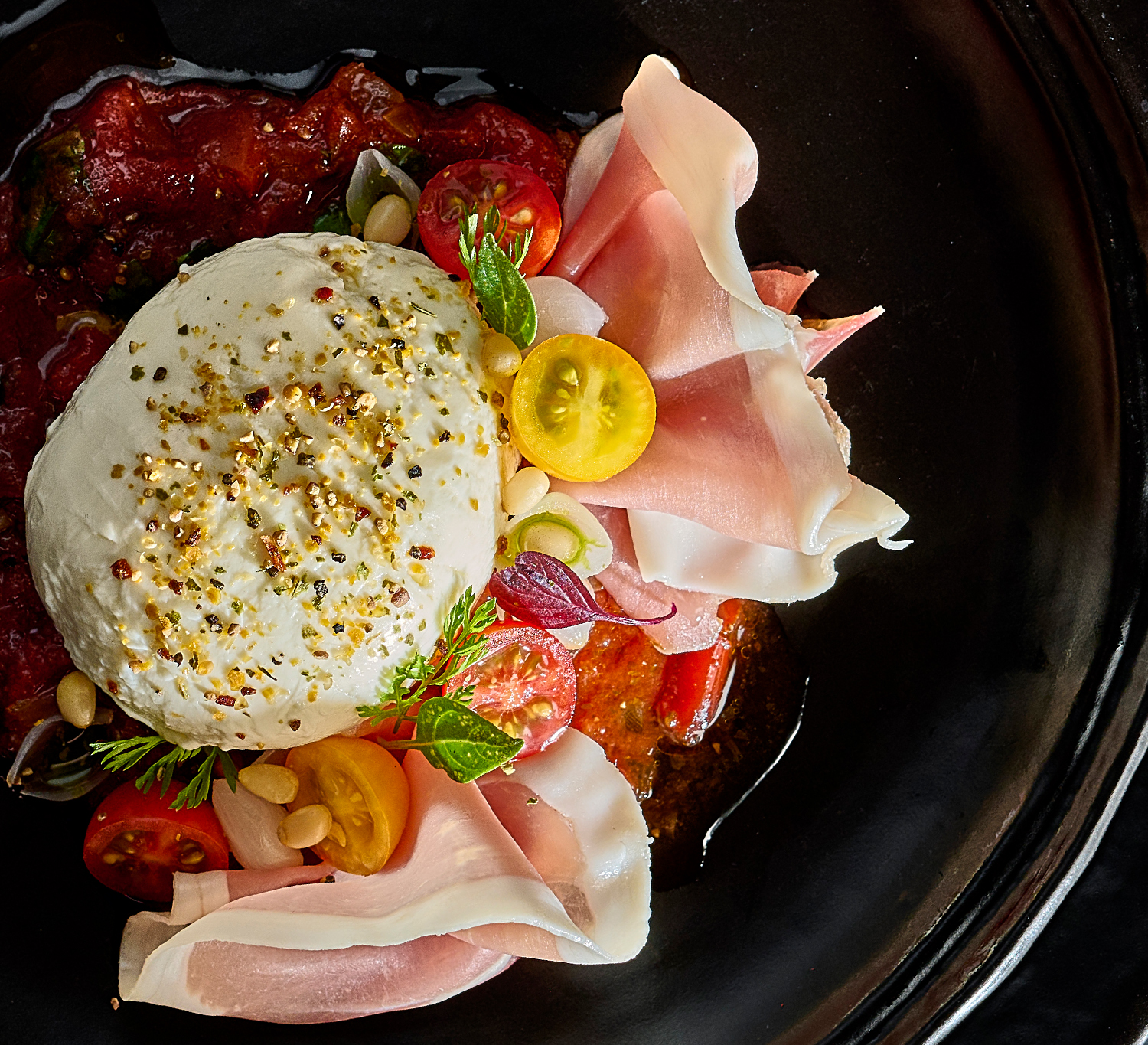 Mozzarella érlelt sonkával, bun 'n rollal, olivás paradicsomraguval, bazsalikom olajjal