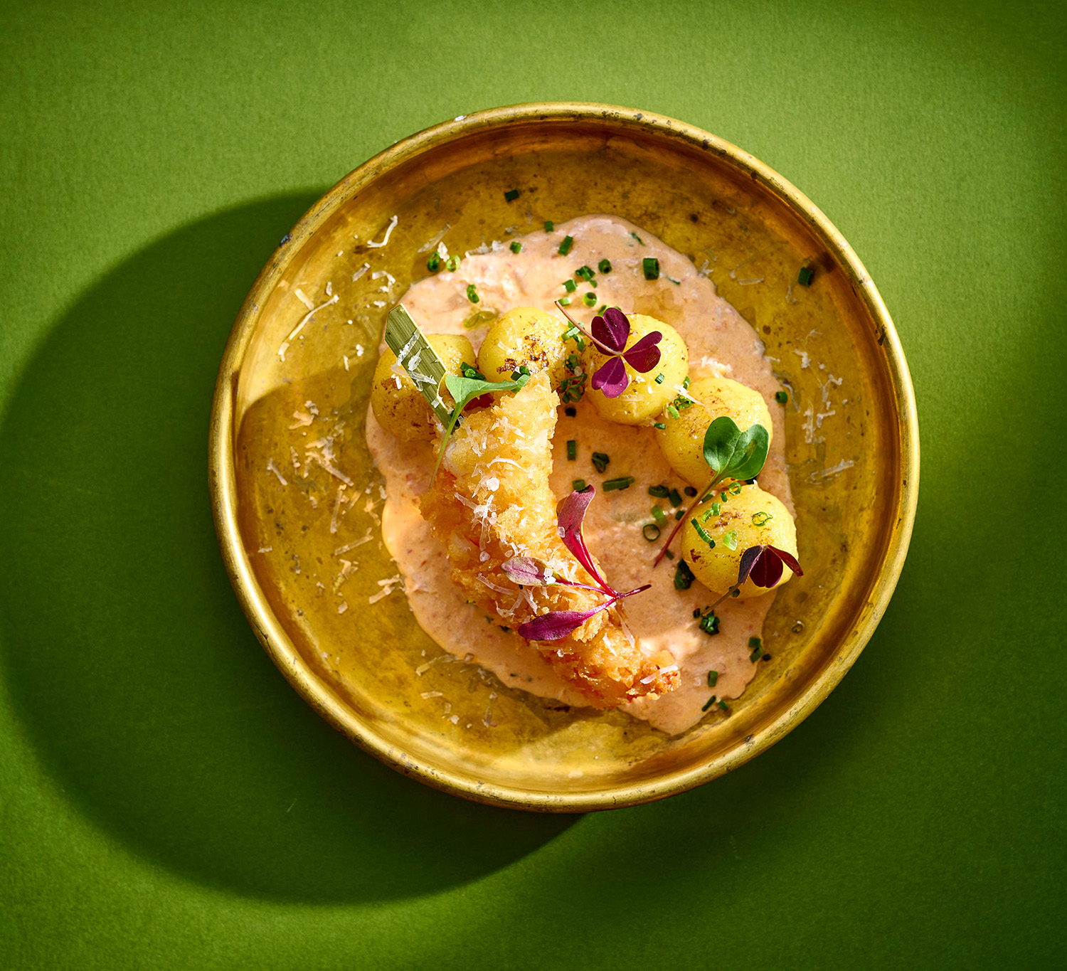 Szarvasgombával töltött gnocchi sült paprika mártásban panko morzsás garnélával
