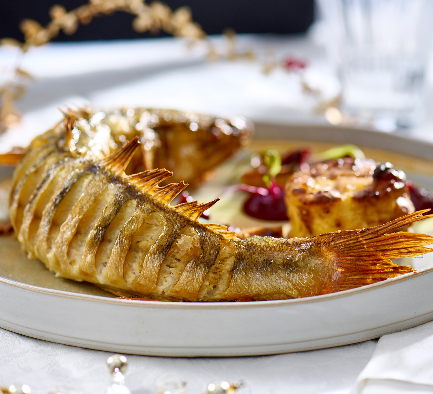 Egészben sült süllő málnaecetes céklakrémmel és burgonya gratin-nel